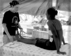 Each day, we walked 20 minutes, or took a bumpy truck ride, to the Camp Hope Physical Therapy Clinic. It’s an open clinic where patients would be waiting when we arrived; appointments were provided on a first-come, first-serve basis Monday through Saturday. The physical therapists arrived around 8:30 a.m. and we worked until about 2:30 p.m. We worked with translators and spent a lot of time demonstrating treatments. We had to get creative, as we didn’t have much in the way of equipment. I instructed a patient in functional mobility by using a water bucket, carrying it around the camp after filling it at the well.