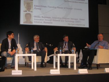 The “Incubating Entrepreneurship” panel discussed strategies, obstacles and examples of incubating and accelerating high growth entrepreneurial ventures. Panelists included Antoine Verdon, co-founder & CEO of Sandbox; Erhan Erkut, founding rector of Ozyegin University; and Ovidiu Bujorean, innovation program manager for The Global Innovation through Science and Technology (GIST) Initiative, CRDF Global.