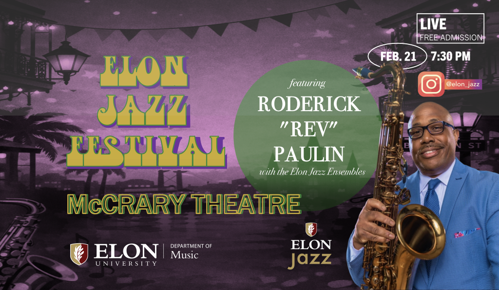 The Elon Jazz Festival culminates in a special performance by the Elon Jazz Ensemble and Jazz Combo featuring Roderick Paulin, one of New Orleans’ most soulful and versatile saxophonists. Sponsored by the Department of Music.