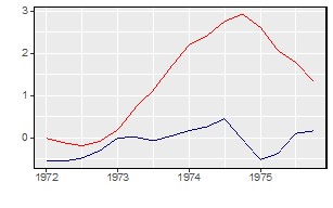 (3) $$CPI_t=β_0+ϕ_1 (CPI_{(t-1)})+ϕ_2 (CPI_{(t-2)})+β_1(capacity)_t+β_2(unemp)_t+β_3(fedfunds)_t+β_4(πs)_t+β_5(I_{1973-74})_t + β_6(πs_{1973-74})_t)+β_7(I_{1979-80})_t + β_8(πs_{1979-80})_t + β_9 (I_{2021-22})_t +β_10 (πs_{2021-22})_t + ε_t$$