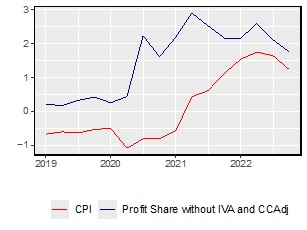 Notes: Profit share ranged from 14-17% from Q2 2021 to Q4 2022. The lowest recorded share of profits in output was 2%, recorded in Q4 2001. Estimates are made with 95% confidence intervals.