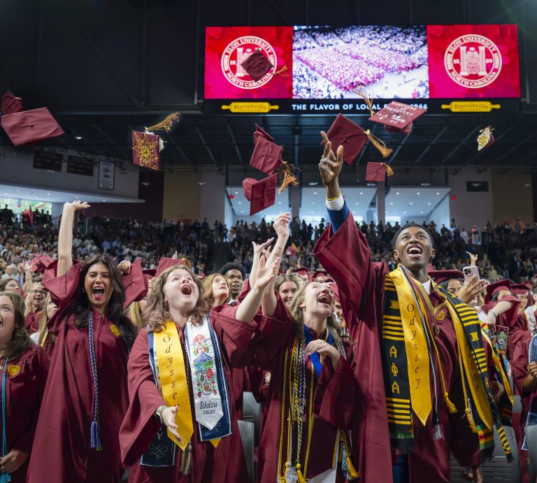 • A recent college graduate in a maroon robe smiles as rainbow confetti falls around them2024