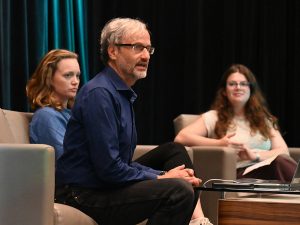 As part of Elon’s participation in the Pulitzer Center’s Campus Consortium, Rainforest Investigations Network Fellows Fernanda Wenzel (left) and Andrew Lehren (center) visited campus Sept. 24-26 to discuss the impact of investigative journalism and working in the news industry. The event was moderated by Elon News Network Executive Director Avery Sloan ’25, who was awarded a Pulitzer Fellowship grant for her reporting project on incarceration in Denmark.