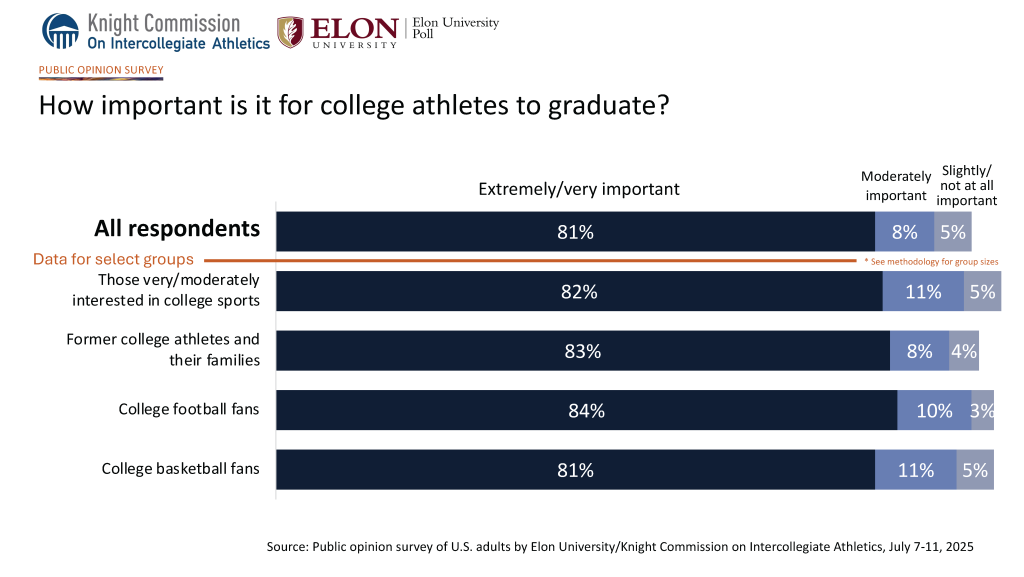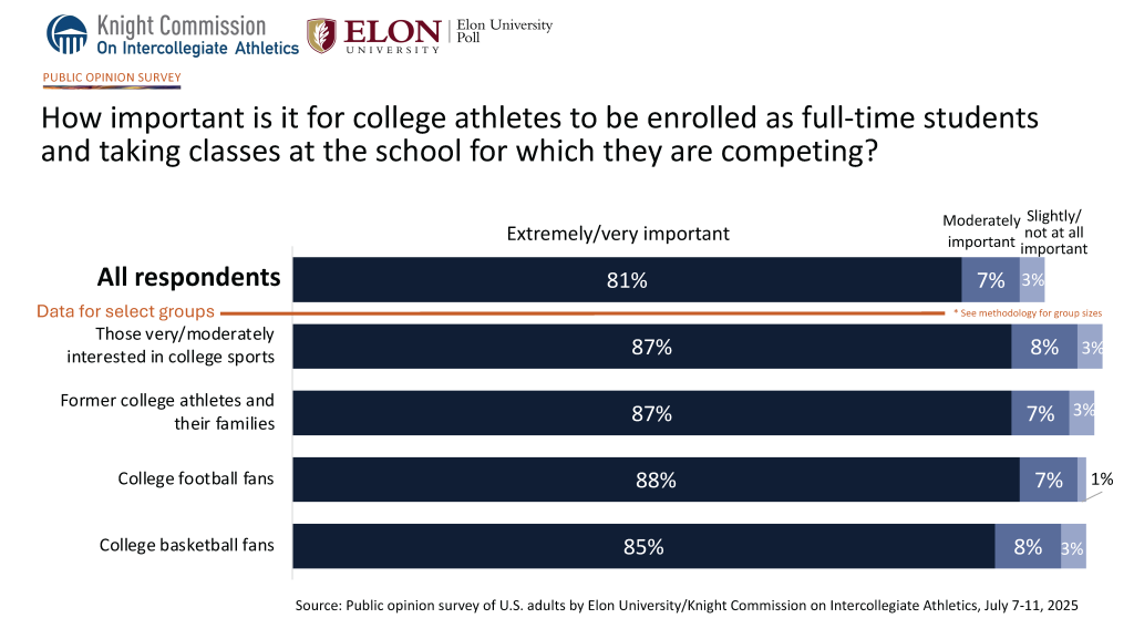 • 81% said it was extremely or very important for college athletes to be enrolled as full-time students taking classes at their institution