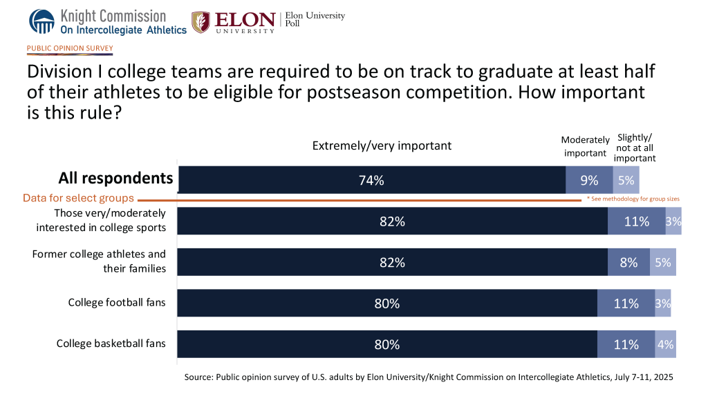 Despite divisions over many issues in college sports, Americans showed overwhelming consensus on maintaining academic standards for college athletes. This educational emphasis crossed all demographic and interest groups: