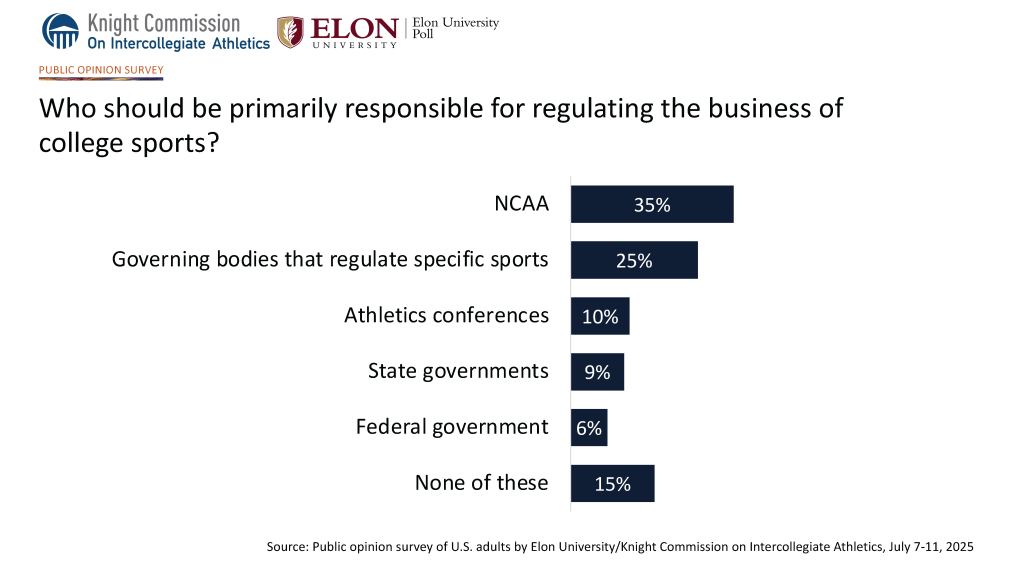 The survey found no public consensus on the organization or entity that should be primarily responsible for regulating the business of college sports. The NCAA remains the top choice, but with only 35% support. The next most popular option was “governing bodies that regulate specific sports” (25%), followed by athletics conferences (10%), state governments (9%) and the federal government (6%). Fifteen percent (15%) chose none of these.