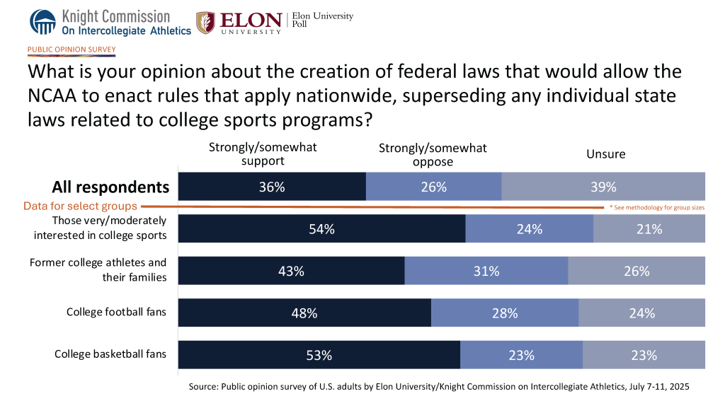 Similarly, most Americans are either skeptical or unsure that Congress should enact legislation to regulate college sports. Only 36% supported the creation of federal legislation to supersede state laws and to allow the NCAA to enact uniform, nationwide rules, while 26% were opposed and 39% were unsure. However, support for new federal legislation was much higher among those respondents who identified as being interested in college sports, with 54% favoring national laws compared with 24% who opposed such legislation.