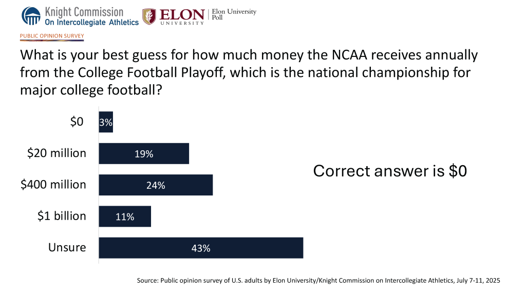 Survey findings revealed that the public lacks a fundamental understanding about the independent business structure of the College Football Playoff (CFP), which operates the FBS football national championship independent of the NCAA. When asked how much money the NCAA receives annually from the CFP, only 3% of the respondents selected the correct answer of $0. More than half (54%) selected options from $20 million to $1 billion, and 43% of the public said they were unsure.