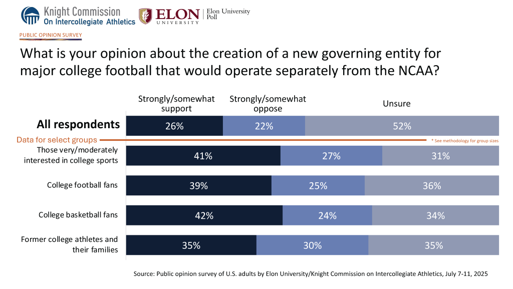 A majority of Americans (52%) were unsure about creating a new FBS football governing body that would operate separately from the NCAA, while the other views were nearly split with 26% supporting the idea and 22% opposing it. College football fans were much more favorable to a new football governing body with 39% supporting, while 36% were unsure and 25% opposed the idea.