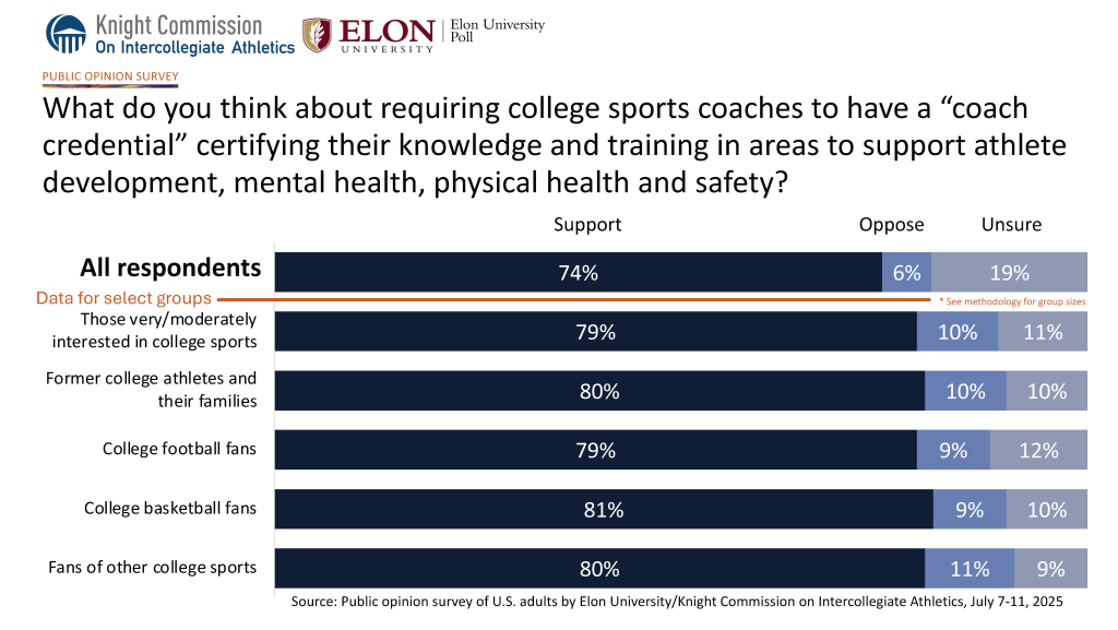 Another area of broad support was requiring college sport coaches to have a “coach credential” that certifies their knowledge and training in athlete development, mental and physical health and safety, with more than 7 in 10 (74%) Americans supporting such a credential with only 6% opposed. Support for a “coach credential” was even stronger (80%) among former college athletes and their families. College coaches are currently not required to earn such a credential.