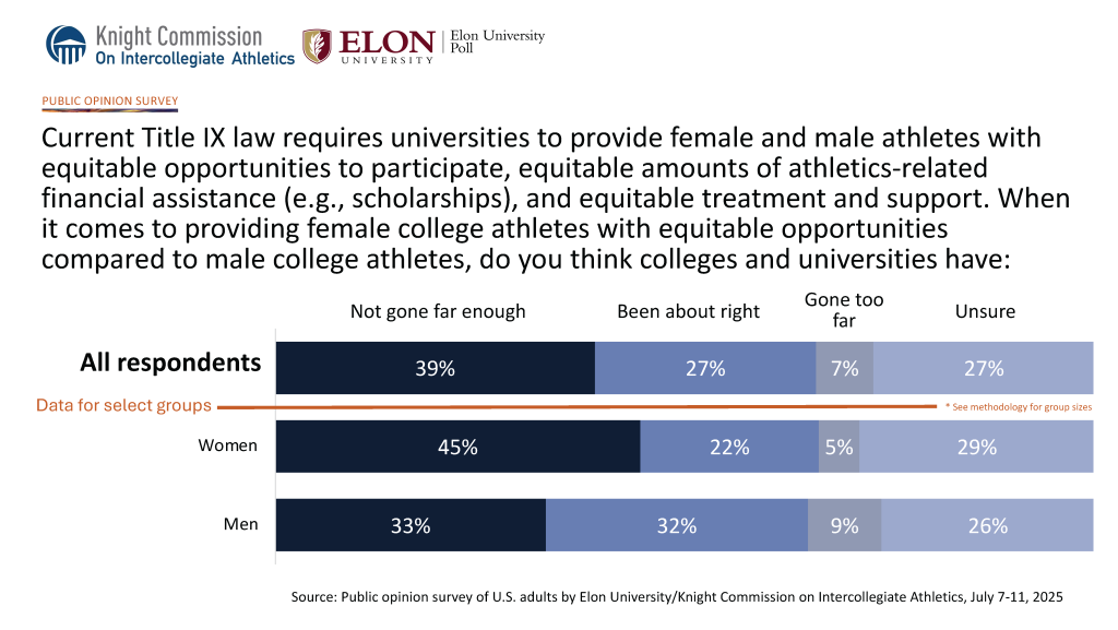 Title IX requires schools to provide female and male athletes with equitable opportunities to participate and equitable financial assistance and treatment. Thirty-nine percent (39%) of Americans believe that schools have “not gone far enough” in providing female athletes with equitable opportunities compared with 27% who said the schools have “been about right” in providing equitable opportunities. More than a quarter (27%) of respondents were “unsure” but only 7% said schools have “gone too far” in providing equitable opportunities to females. Women (45%) were more likely than men (33%) to say that schools have “not gone far enough” in providing equitable opportunities to female athletes.