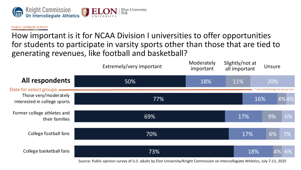 Nearly 7 in 10 Americans (68%) said it is important for universities to offer opportunities for students to participate in varsity sports other than those that are tied to generating revenues, like football and basketball. Among those interested in college sports, the support for these opportunities was even higher, with more than 9 in 10 respondents (93%) saying these varsity sports opportunities beyond football and basketball are important.