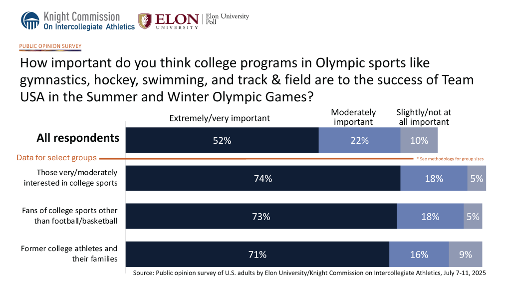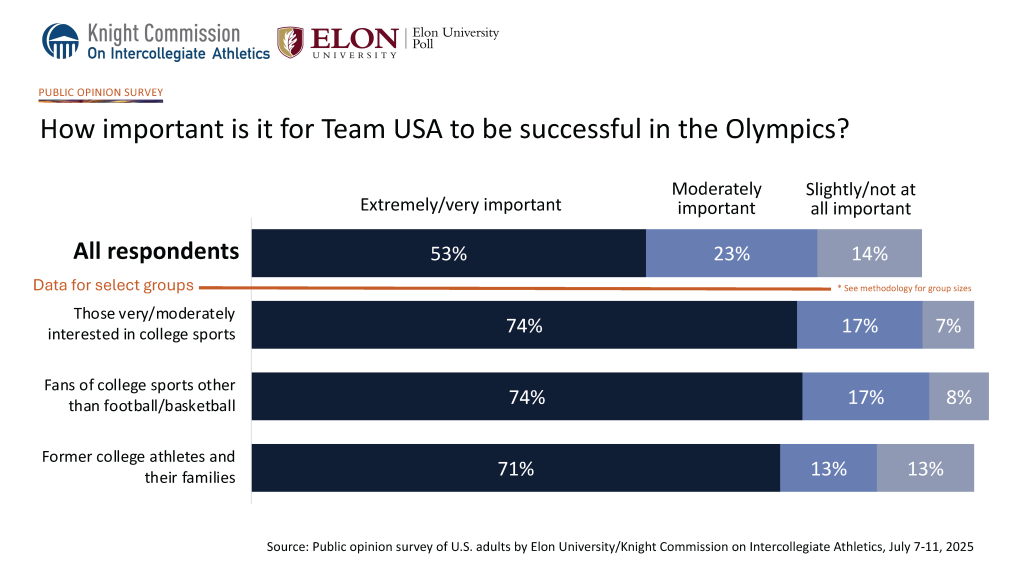 The survey also found wide support for Team USA, with 76% of Americans saying it is moderately to extremely important that Team USA is successful in the Olympics. Among those interested in college sports, 92% said that college programs such as gymnastics, track & field, swimming, and hockey are important to the success of Team USA in the Summer and Winter Olympic Games.