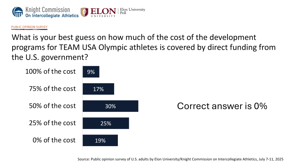 While Americans strongly support the importance of Team USA’s success in the Olympics, there is a lack of knowledge about the funding that fuels the development of U.S. Olympians. More than 8 in 10 Americans (81%) erroneously thought that the U.S. government provides funding for Team USA development programs (it does not).