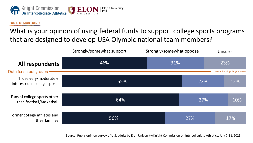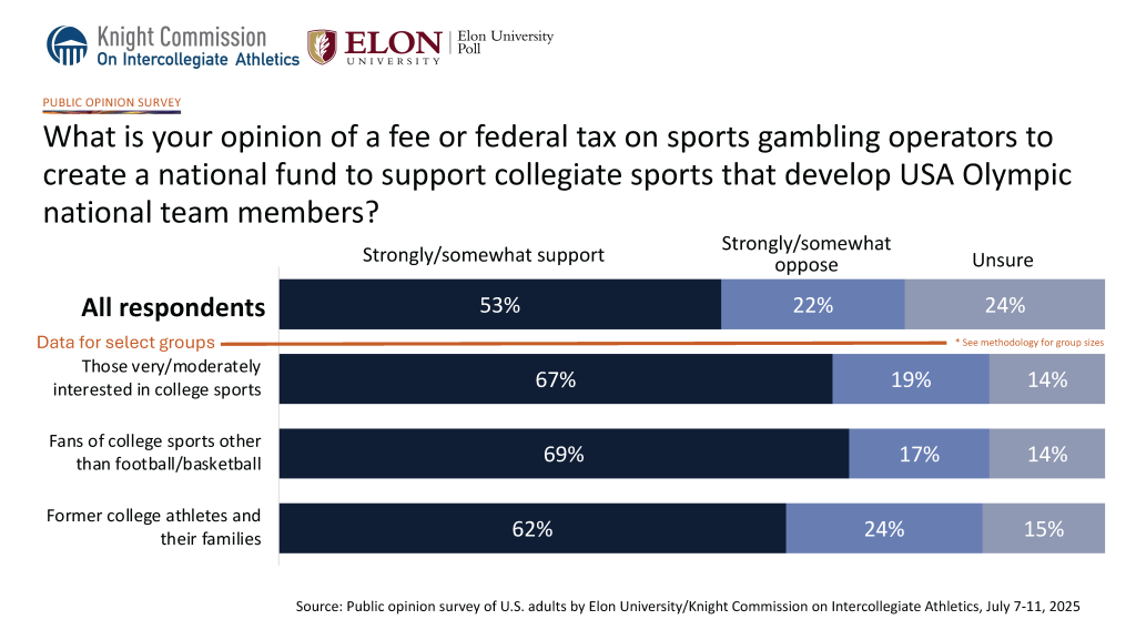 Overall, nearly half (46%) of American adults favored using federal funds to help finance college sports programs to develop USA Olympic national team members and two-thirds (65%) of those interested in college sports supported that idea. A majority of Americans also supported enacting a fee or federal tax on sports gambling operators to create a national fund to support collegiate Olympic sports, with 53% of Americans supporting that idea, compared with 22% who opposed such a fee.