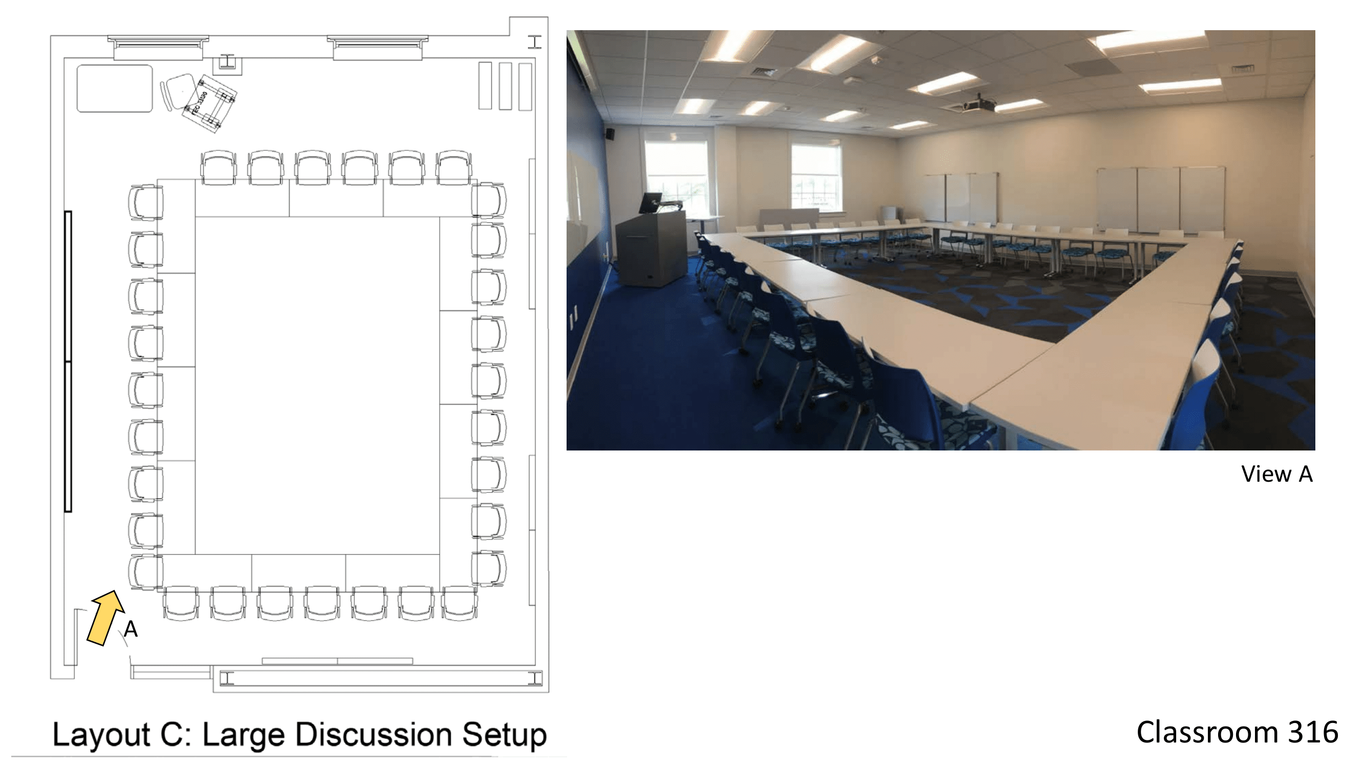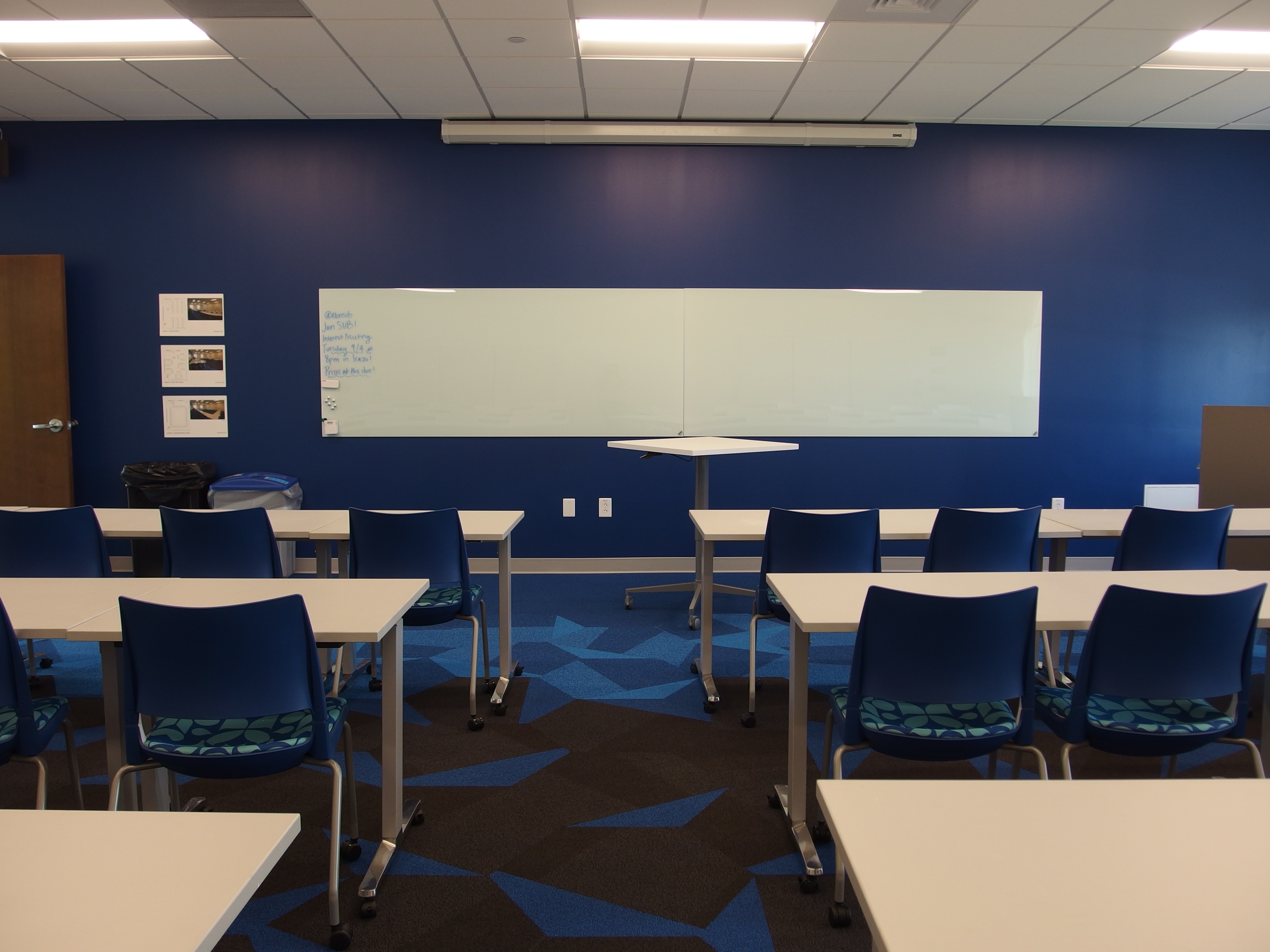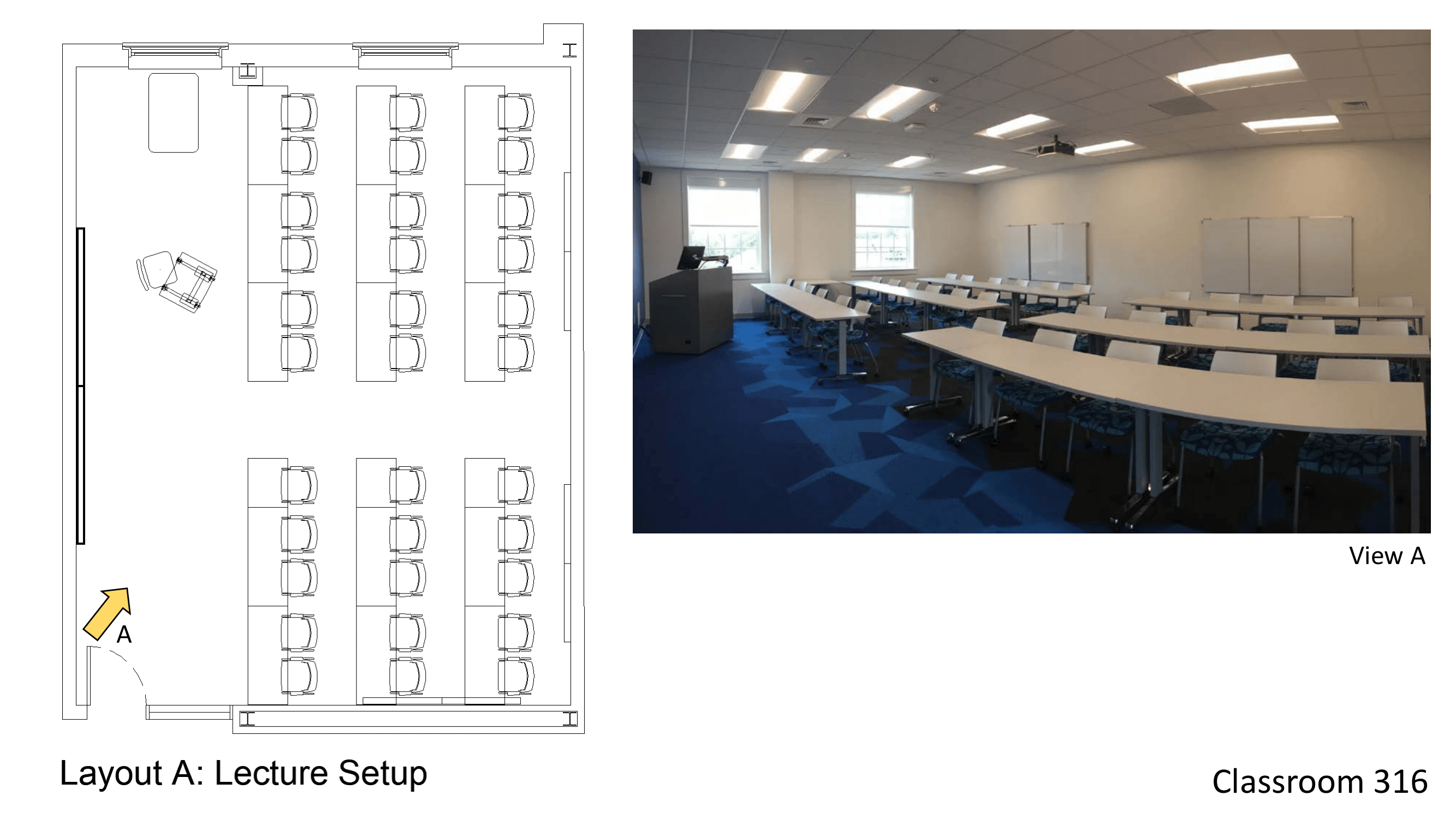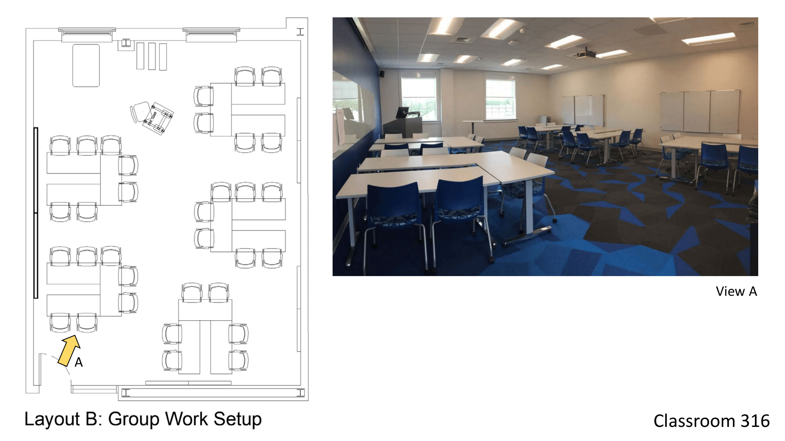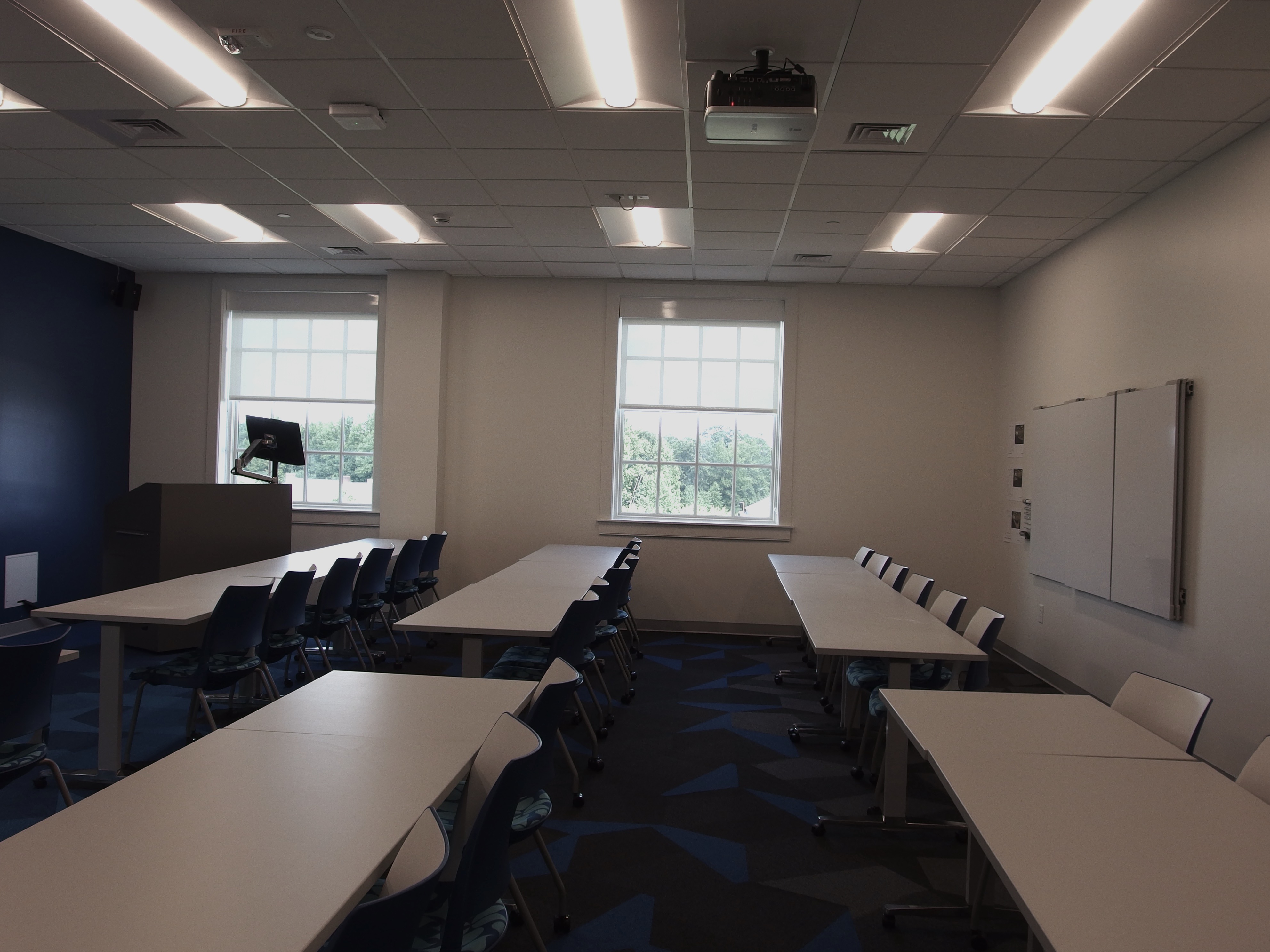 Sankey 316 premiered when Sankey Hall opened in Fall 2018. Like many other active learning spaces on campus, Sankey 316 can be rapidly reconfigured to support different instructional approaches. AirMedia comes standard in the room to facilitate easy device connection without the use of cables or adapters. Aside from two styles of window blinds, professors also enjoy extra classroom lighting control though the use of dimmer switches.