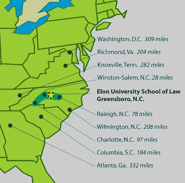 Elon Law is conveniently located near major metropolitan areas and is within easy flying and driving distance of most East Coast cities.
