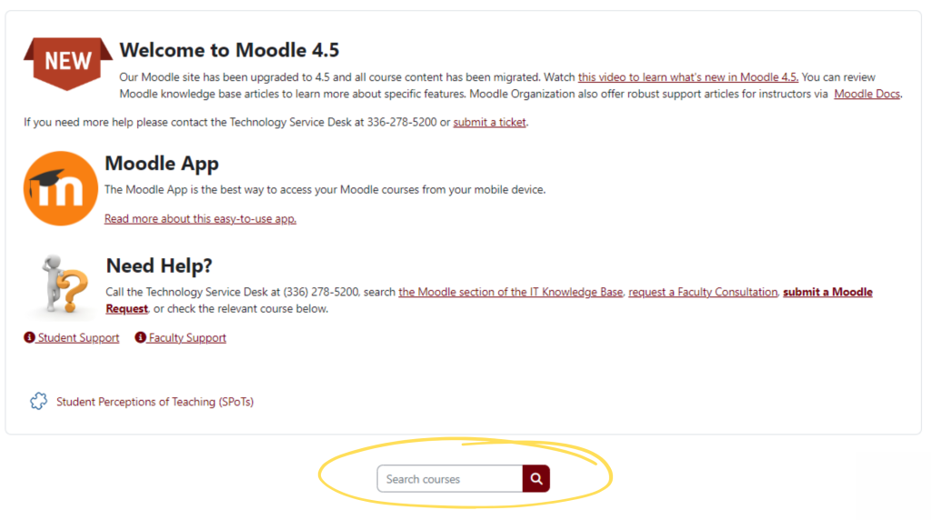 Step Three: Once you’re on the Moodle homepage, you’ll notice a “search courses” box at the bottom of the page. Click in the box and search for “Elon Law Orientation Checklist Class of 2027”