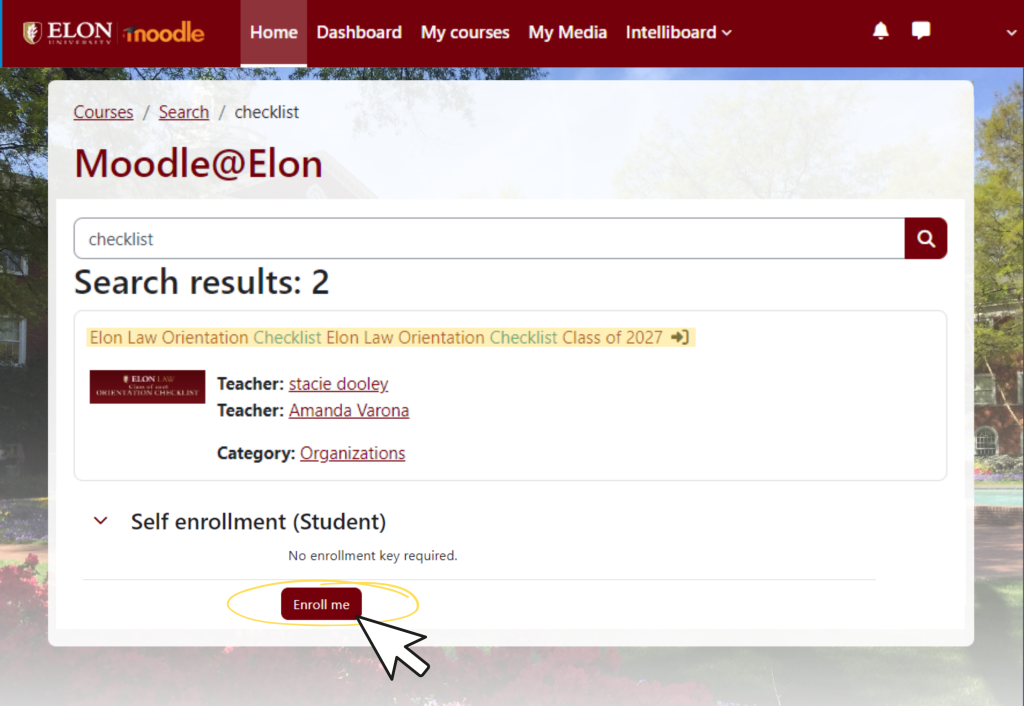 Step Four: Click on the Elon Law Orientation Checklist course and click on the “Enroll me” button.