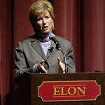 Christine Todd Whitman, Elon’s second Isabella Cannon Distinguished Visiting Professor of Leadership, discussed the political roadblocks that prevent a consensus on environmental policy during the first of two public lectures Tuesday, March 1 in McCrary Theatre.