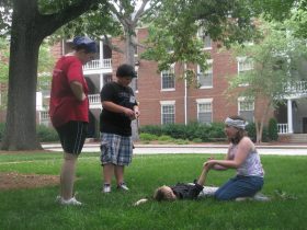 The grassy area in front of Mooney doubled as a hospital ward, battleground and infirmary Tuesday morning as several academically gifted students enrolled in Elon’s inaugural Formative Learning Experience program – “FLEX” for short – learned about first aid and took turns dramatizing emergency situations.
