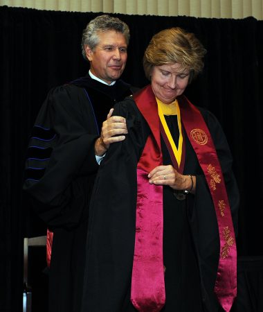 Pamela M. Kiser, Watts-Thompson Professor in the Department of Human Service Studies, was formally awarded the Distinguished University Professorship at a special investiture ceremony on Oct. 4. The board of trustees conferred the professorship on Kiser last spring, and the special ceremony was an opportunity to celebrate Kiser's contributions to teaching, scholarship and service to the Elon University community.