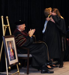 “You are a creative teacher, a caring mentor, a thoughtful and incisive scholar, a wise leader and a community member bringing into being our shared vision for Elon,” Lambert said to Kiser.