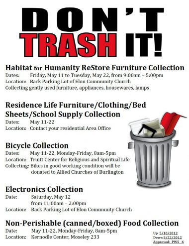 Resources are available through May 22 to assist students with donating or recycling furniture and other items they can't take home with them.