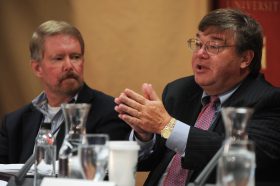 The panel, which took place in an auditorium at The Charlotte Observer, included Taylor Batten of The Charlotte Observer; Rob Christensen of The (Raleigh, N.C.) News & Observer; Charlie Cook of The Cook Political Report and the National Journal; David Gergen of CNN and the Harvard Kennedy School; Anita Kumar, McClatchy Newspapers White House correspondent; and Domenico Montanaro, NBC News deputy political editor. Former Greensboro, N.C. News & Record Editor John Robinson served as moderator.