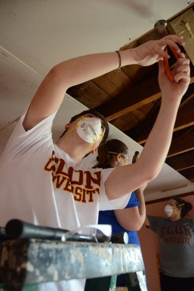 “I’ve learned how much patience and perseverance it takes to complete (renovation) projects. I must have sanded for eight hours!” said Elon sophomore Grace Troccoli. “At the end of the day, when I look at the house, it looks a lot better than when we first arrived. And the storm really served as a catalyst to attack deep-rooted problems with the city. When you rebuild, you have a chance to change.”
