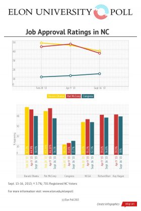 Forty-six percent expressed disapproval of North Carolina Gov. Pat McCrory’s performance, and as with the president, the governor’s numbers also hinge on party affiliation. Fifty-eight percent of Republicans approve of McCrory’s job performance compared to 18 percent of Democrats.