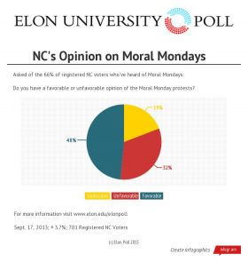 Sixty percent of registered voters had heard of the Moral Monday protests that have garnered North Carolina national attention in recent months, and nearly half (48 percent) of respondents familiar with the protests expressed a favorable opinion of them. Thirty-two percent said they have an unfavorable view of the Moral Monday protests. Nineteen percent said they didn’t know how they felt.