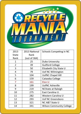 It also is another opportunity to compete to be among the top schools in North Carolina and the nation. In 2013 Elon ranked 161st out of the 364 schools competing in the RecycleMania Per Capita Classic, and the university ranked 7th out of the 14 North Carolina schools in the competition.