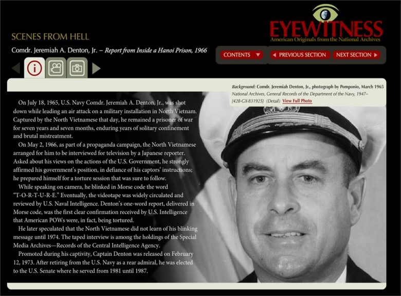 Watch Footage of the film taken by Japanese journalists in 1966 showing Rear Admiral Jeremiah Denton Jr. during his 91-month ordeal as a prisoner of war in North Vietnam. While speaking on camera, Denton blinked in Morse code the word “torture.” To see the video, click on the “Contents” tab and select his entry under “Scenes from Hell.”