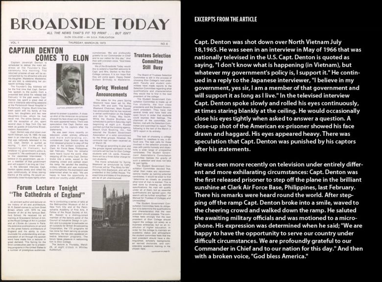 About a month after his return home, Denton gave a dramatic address and news conference at Elon’s Founders Day ceremony surrounded by thousands of spectators and media outlets. He provided the first public account of the extensive torture U.S. prisioners endured during their captivity.