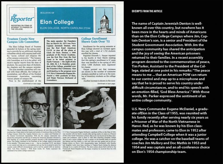 Denton spent seven years and seven months as a POW in North Vietnam after his plane was shot down in 1965. He was tortured repeatedly and kept in solitary confinement for four years. During his time as a POW in Hanoi, Denton struck a friendship with U.S. Navy Cmdr. Eugene McDaniel ’55. Denton’s son, Jim, was a student at Elon (he served as student body president), and the college became a common topic of conversation between the two men.