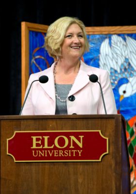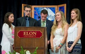 Before Patel spoke, University Chaplain Jan Fuller remembered Michelle Pfleger and Jordan West, two students from the Class of 2014 who died during their time at Elon. She reminded the graduates, who were seated before her surrounded by family and friends, to make Pfleger and West proud as they go forward and to be thankful to the people who helped them get to this point.