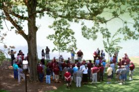 Dozens of members of the Elon community gathered at the edge of Lake Mary Nell to remember university automotive mechanic Ed Watkins.