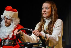 On Christmas Eve, as she anticipates an idyllic holiday shared with her husband and small children, Rachel learns that her life is in danger. Fleeing home in her slippers and robe, she begins a strange odyssey across a darkly comic America. The zany play poses questions about family, loss, identity and Santa Claus.