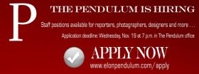 The Pendulum invites you to apply to join its award-winning news organization for the 2015 calendar year. Applications for all positions on staff are now available and must be turned in at The Pendulum office (third floor of the Elon Town Center) by 7 p.m. on Wednesday, Nov. 19.