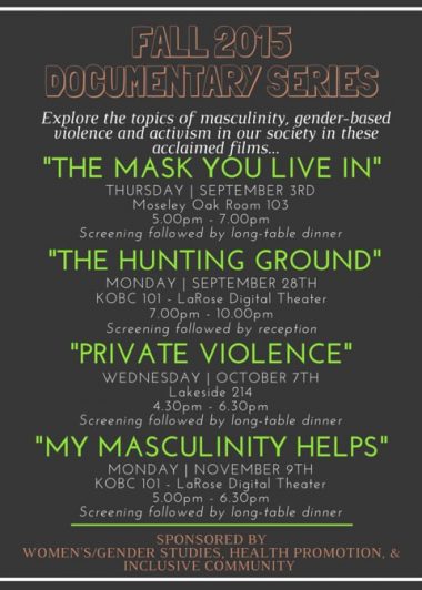 Looking to explore the topics of masculinity, gender-based violence, and activism in our society? If this interests you, check out the documentary series this fall sponsored by Women's/Gender Studies, Health Promotion, and Inclusive Community!