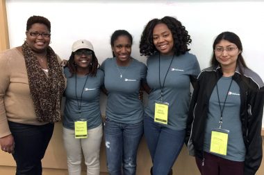 Interactive Media students Tarah Holland and Erin Turner ’15 participated in a five-person team that placed second at the 2015 Code for Greensboro Civicon Hackathon and Convention. Pictured (from left) are Holland, Treavia Marshall, Shade Petteway, Turner and Stuti Manandhar. Photos courtesy of Holland.Tarah Holland and Erin Turner ’15, graduate students in Elon’s Interactive Media master’s program, placed second at the inaugural Code for Greensboro Civicon Hackathon and Convention, held Nov. 6-8 in downtown Greensboro. The Elon duo teamed with three fellow female hackers to build a community-centered web app, called Triad’s Serving Hands, that promotes the location and use of local food donation sites.