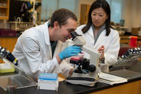 On any given day, senior Zachary Fisher can be found in one of the labs in McMichael working on his Lumen Prize research with Associate Professor of Biology and Japheth E. Rawls Professor Yuko Miyamoto. Since Fisher first started studying the molecular signaling role of fibroblast activation protein in cancer cell migration, Miyamoto has been by his side guiding every step of his research journey. “She has helped me learn to develop focused research questions, experiment with techniques to get successful lab results and most recently present my research story to audiences,” he says. So far, the biology major has been able to verify the presence of the protein on a cell line—taken from a non-affected region of a cancer patient—he purchased for his project. Though he says his finding is just the first step, identifying the protein in a purchased cell line is significant because it allows him to perform his research in new ways. Outside academic conversations, the two often discuss Fisher’s non-science interests, which revolve around his passion for service, career and life goals. Having such an ally has been priceless. “Dr. Miyamoto has been a terrific mentor, academically, professionally and personally,” he says. “I feel that I can share all my thoughts and concerns with her, which is an invaluable quality in a mentor. She truly embodies the Elon professor model as a teacher, researcher and mentor.”