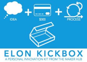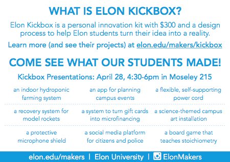 This spring the Maker Hub launched the Elon Kickbox grant program. A Kickbox is (literally) a box filled with resources, a process for making an idea a reality, and $300. Ten students and teams have spent spring semester pursuing and building their ideas with Kickbox, and are working on everything from a model rocket recovery system, to a smart mirror that can tell you the weather or compliment you, and a board game that teaches chemistry concepts. Check out the flyer (below) and the Kickbox website for a list of projects and come see the results of their efforts!