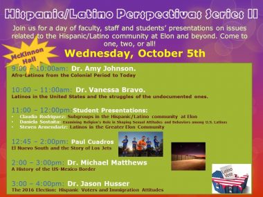 Join us for our day series of faculty, staff and students’ presentations on issues related to the Hispanic/Latino community at Elon and beyond. Come to one, two, or all!