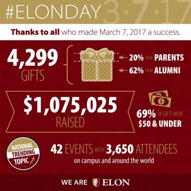 Engagement on social media also hit a peak, with #ElonDay becoming a national trending topic during a 24-hour celebration that called for the university community to proudly proclaim, “We are Elon!” Alumni giving was a key factor in the day’s success, with 62 percent of gifts coming from Elon graduates, while gifts of $50 and under accounted for 69 percent of Elon Day contributions.