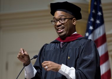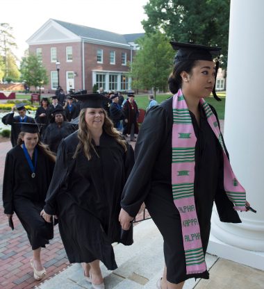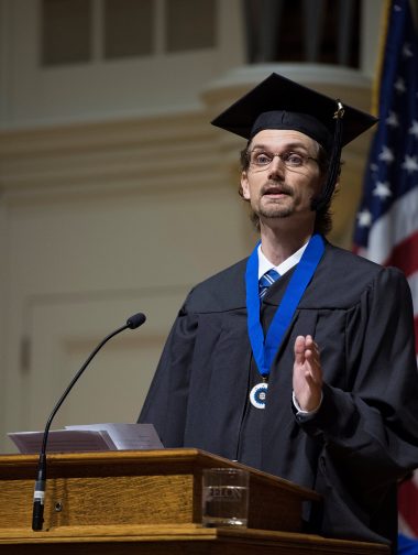 In his charge to the new graduates, Elon President Leo M. Lambert encouraged them to use the skills they have learned to help restore public trust during a time when it is lacking, noting Elon’s motto — Numen Lumen — which are Latin words denoting spiritual and intellectual light.