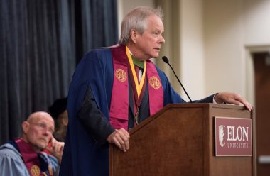 “You are both creative teachers and caring mentors, thoughful and insightful scholars, wise leaders and community members working to bring into being our shared vision for Elon,” said President Leo M. Lambert at the ceremony. “You both exemplify what is best about Elon University.”