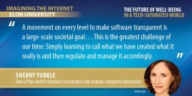 Sherry Turkle one of the world’s foremost researchers into human-computer interaction was one of the experts who offered up solutions for improving digital life’s impacts on individuals’ well-being. She suggested: “1) Working with companies in terms of design – [digital tools] should not be designed to engage people in the manner of slot machines. 2) [Starting] a movement on every level to make software transparent. This is a large-scale societal goal! 3) Working with companies to collaborate with consumer groups to end practices that are not in the best interests of the commons or of personal integrity. 4) A fundamental revisiting of the question of who owns your information. 5) A fundamental revisiting of the current practices that any kind of advertisement can be placed online (for example, ads that are against legal norms, such as ageist, sexist, racist ads). 6) Far more regulation of political ads online. 7) An admission from online companies that they are not ‘just passive internet services.’ 8) Finding ways to work with them so they are willing to accept that they can make a great deal of money even if they accept to be called what they are! This is the greatest business, political, and social and economic challenge of our time, simply learning to call what we have created what it really is and then regulate and manage it accordingly, bring it into the polity in the place it should really have.”