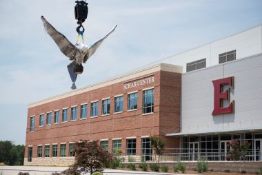 A new phoenix landed on Elon’s campus on Monday and will now greet visitors to the university’s Schar Center when the 5,100-seat facility opens later this year.